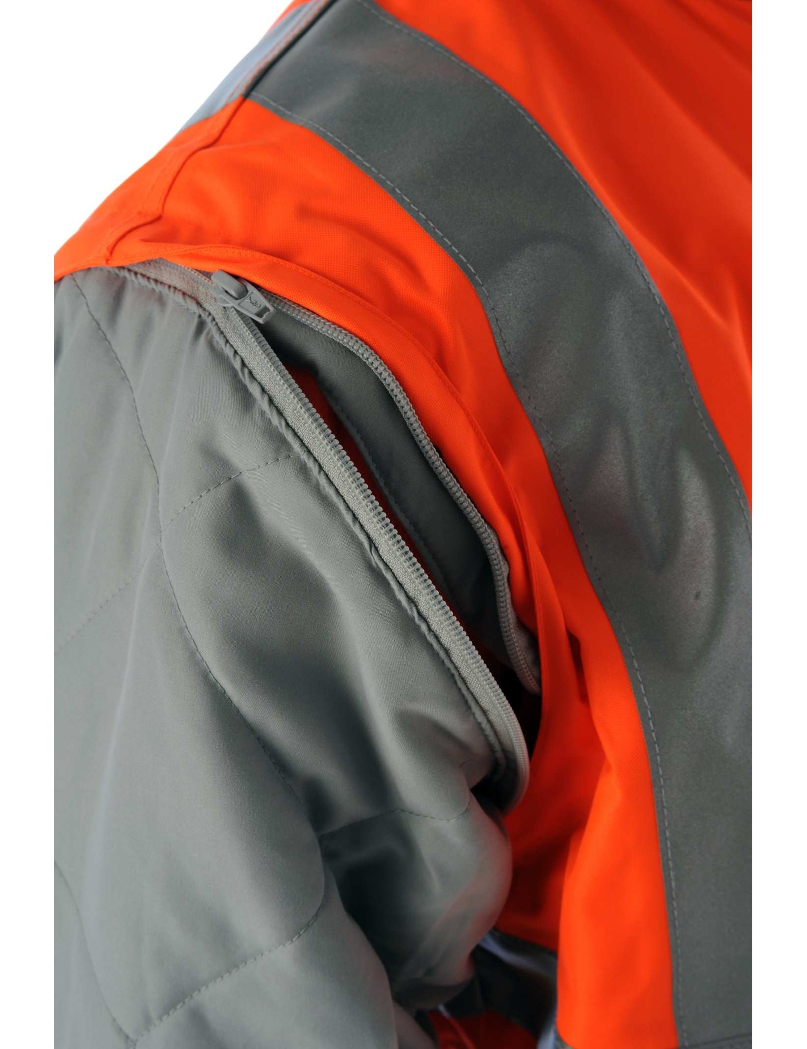 Zip off detachable sleeves with knitted cotton cuffs.