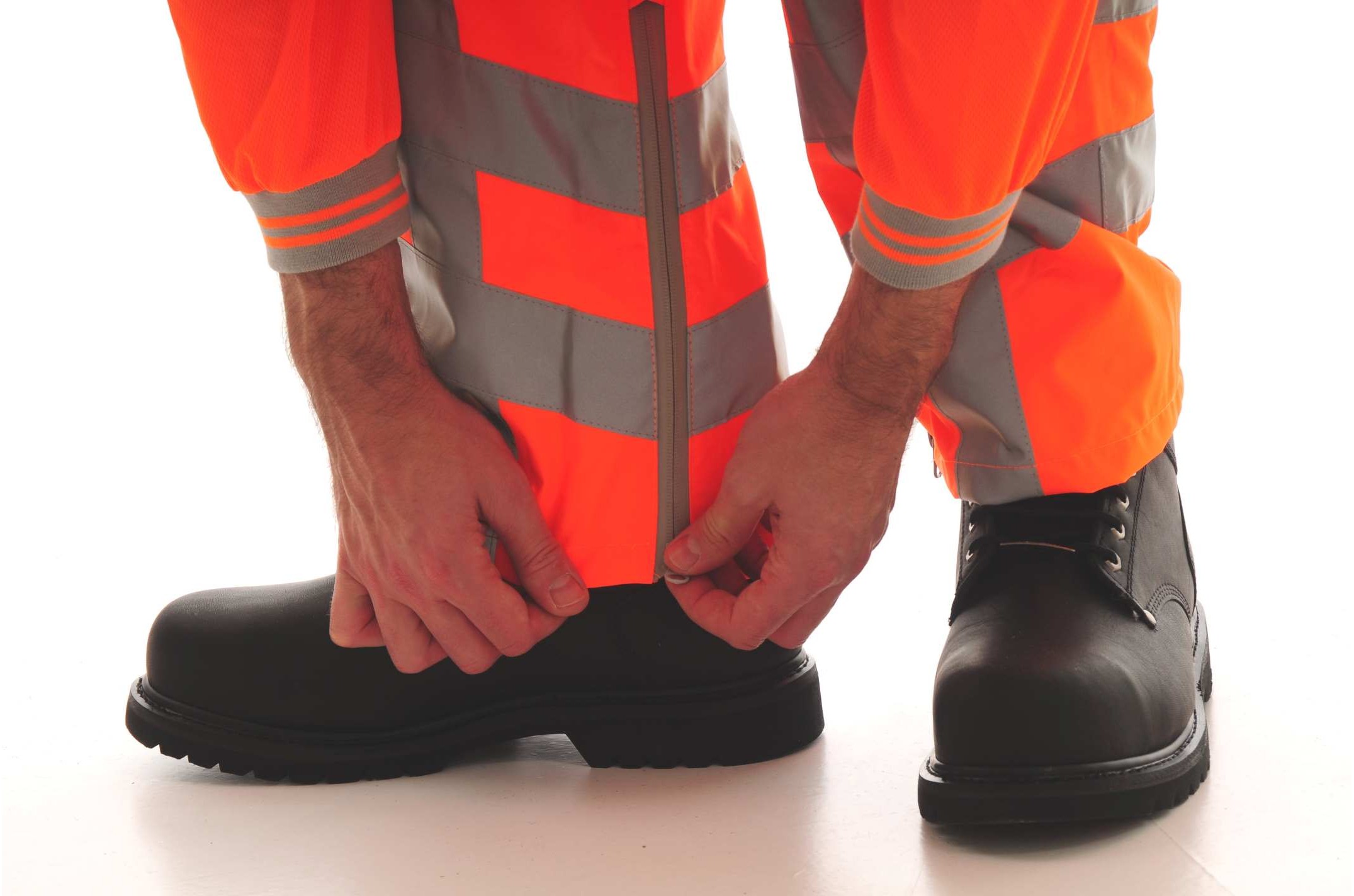 Gusseted at hem of legs with waterproof zips for ease over work boots, as well as preventing excess dirt from jamming zips.